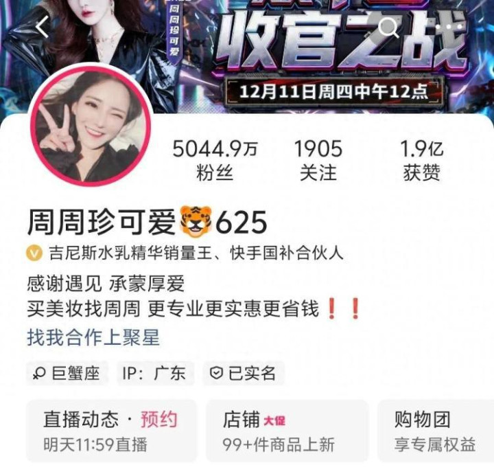 “周周珍可爱625”实名为周珍,账号店铺营业执照为广东嘉星投资集团有限公司。天眼查APP显示,周珍为广东嘉星投资集团有限公司股东,持股比例为99%。