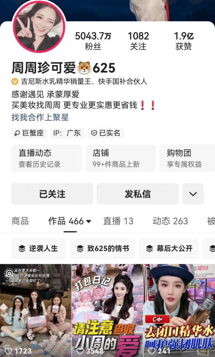 封面新闻记者查询发现,“周周珍可爱625”在该平台拥有5044.7万粉丝,在另一短视频平台还拥有超500万粉丝。其店铺位列平台面部护肤店铺榜第5名,近期销量超过99%的同行,近7天热卖商品超10万件。