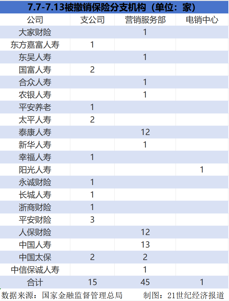 事实上,今年以来,保险公司密集撤销分支机构。据21世纪经济报道记者不完全统计,截至7月14日,今年已有超1000家保险分支机构被裁撤,保险分支机构正以平均一天5家的速度撤离市场。